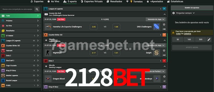 O 2128Bet oferece uma grande seleção de opções de apostas em e-sports com probabilidades competitivas